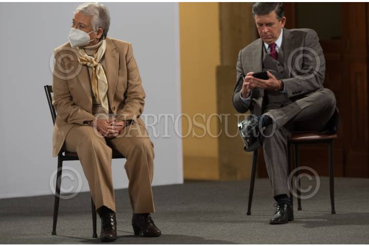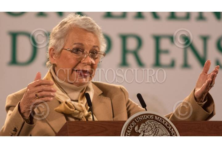 La titular de Gobernación, Olga Sánchez Cordero, en la conferencia matutina en el salón tesorería de Palacio Nacional