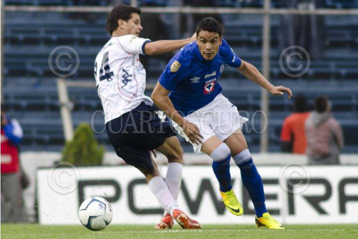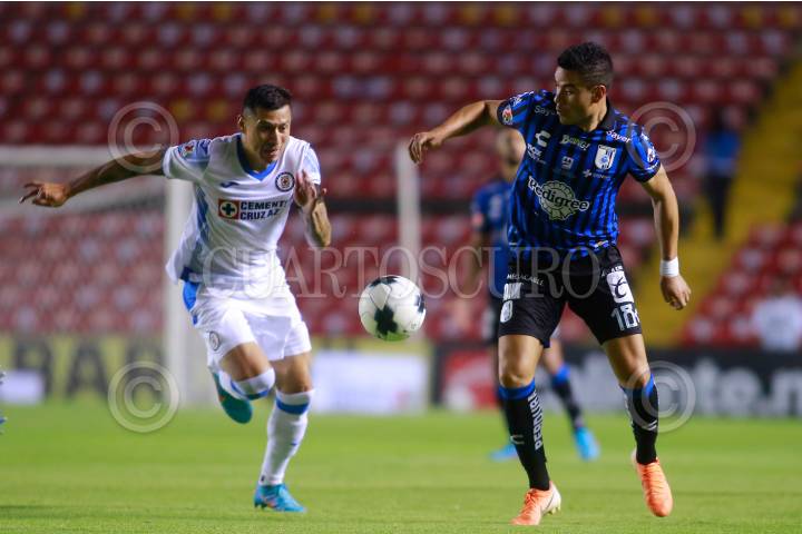 Pablo Barrera (Querétaro) intenta controlar un balón ante un jugador del Cruz Azul.