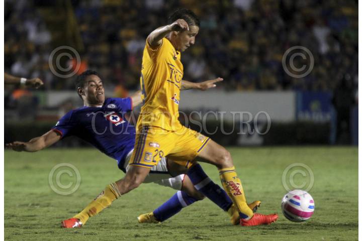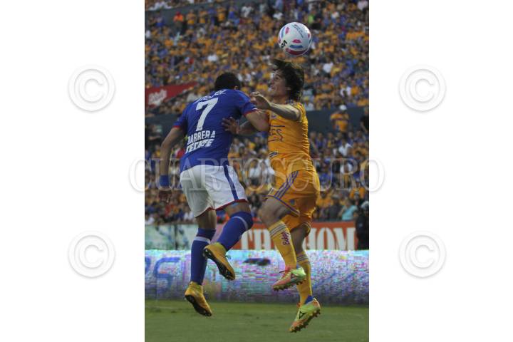 SAN NICOLAS DE LOS GARZA, NUEVO LEON, 18OCTUBRE2014.- Jesús Duenas del equipo de los Tigres de la UANL se disputa el balón contra Pablo Barrera del equipo del Cruz Azul, en el estadio Universitario, partido correspondiente a la jornada 13 de la Liga MX, Apertura 2014. FOTO: GABRIELA PEREZ MONTIEL /CUARTOSCURO.COM