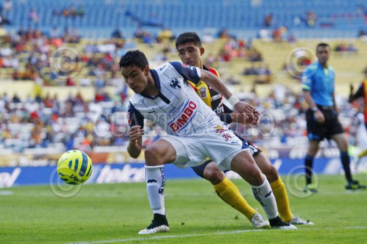 GUADALAJARA, JALISCO, 11ENERO2015.- En la imagen Pablo Barrera y Jairo González, disputan el balón durante el juego entre Leones Negros de la Universidad de Guadalajara y el equipo de Monterrey, en partido correspondiente a la Jornada 1 del Torneo Clausura 2015 de la Liga MX donde los Leones Negros vencieron un gol a cero a los Rayados del Monterrey. FOTO: FERNANDO CARRANZA GARCIA / CUARTOSCURO.COM