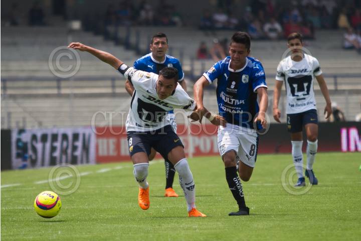 CIUDAD DE MÉXICO, 29ABRIL2018.- El lateral de los Pumas de la UNAM, Pablo Barrera, intenta desbordar a la defensa de los Gallos Blancos del Querétaro, durante el encuentro que se celebra en el Estadio Olímpico, al medio tiempo los universitarios tienen una victoria de 1-0. FOTO: MOISÉS PABLO /CUARTOSCURO.COM