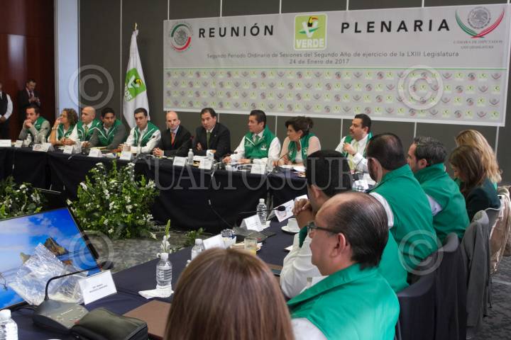 CIUDAD DE MÉXICO, 24ENERO2017.- Pablo Escudero, presidente de la mesa directiva del Senado; Carlos Alberto Puente Salas, coordinador de los senadores del Partido Verde Ecologista de México (PVEM), y la senadora María Elena Barrera Tapia, durante los trabajos de la Reunión Plenaria del Partido Verde de la LXIII Legislatura de la Cámara de Diputados. FOTO: MOISÉS PABLO /CUARTOSCURO.COM
