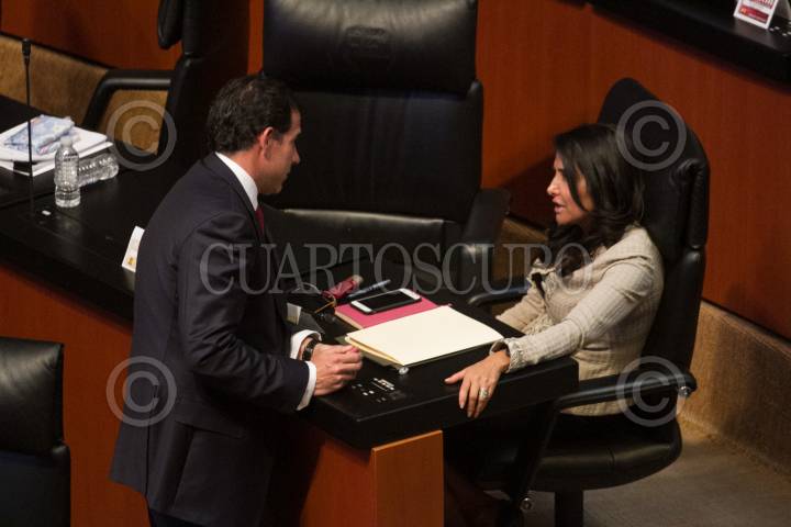 CIUDAD DE MÉXICO, 27ABRIL2017.- Pablo Escudero y Alejandra Barrales conversan en la sesión del Senado de la República. FOTO: MOISÉS PABLO /CUARTOSCURO.COM