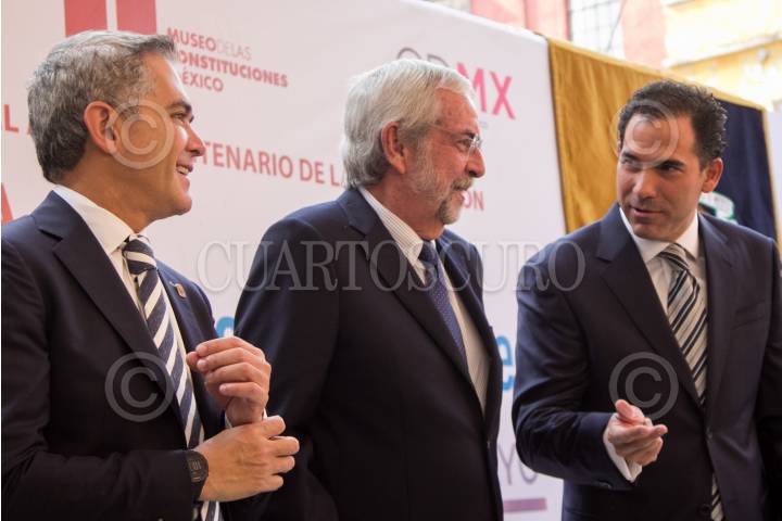 CIUDAD DE MÉXICO, 02MAYO2017.- Miguel Ángel Mancera, jefe de gobierno de la Ciudad de México, Enrique Graue Wiechers, rector de la Universidad Nacional Autónoma de México (UNAM), y Pablo Escudero, presidente de la mesa del Senado, durante la reinauguración del museo de las Constituciones, en el centro. FOTO: GALO CAÑAS /CUARTOSCURO.COM