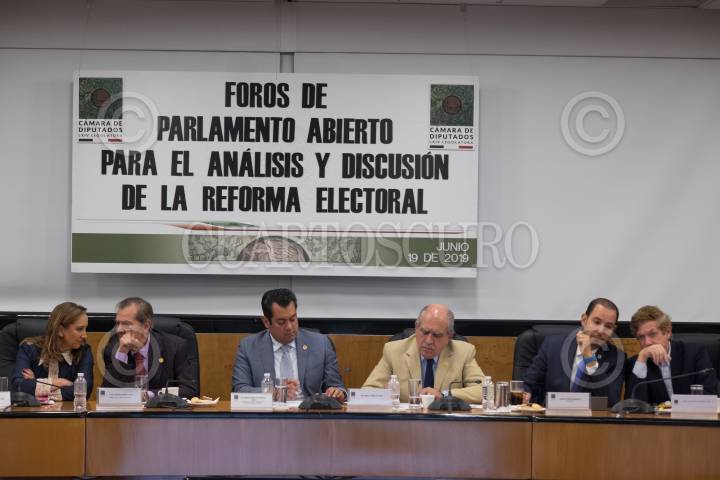 CIUDAD DE MÉXICO, 19JUNIO2019.- Claudia Ruíz Massieu, presidenta del PRI; Porfirio Muñoz Ledo, presidente de la mesa directiva de la Cámara de Diputados; Sergio Carlos Gutiérrez Luna, coordinador del Grupo de Trabajo para la Reforma del Estado y Electoral; el diputado Pablo Gómez Álvarez; Marko Cortés Mendoza, dirigente nacional del PAN y Juan Carlos Romero Hicks, coordinador del PAN, durante el Foro de parlamento Abierto para el análisis y discusión de la Reforma Electoral en la Cámara de Diputados. FOTO: GRACIELA LÓPEZ /CUARTOSCURO.COM