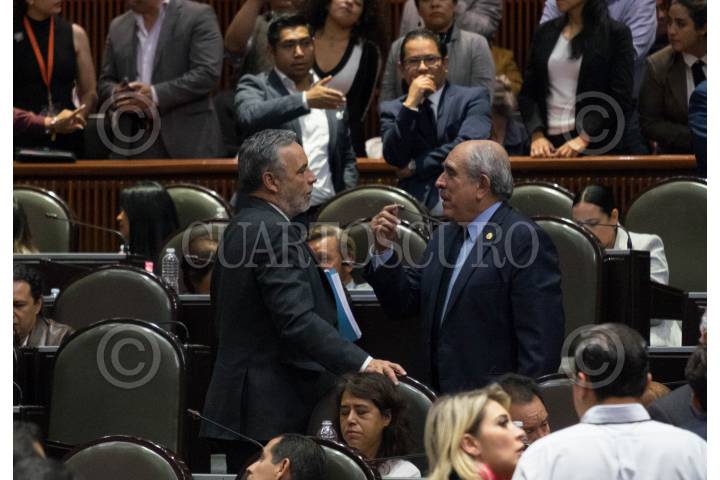 CIUDAD DE MÉXICO, 27JUNIO2019.- Alfonso Ramírez Cuéllar, secretario de la Comisión de Hacienda y el diputado Pablo Gómez Álvarez del partido de Morena conversaron durante la la Sesión Extraordinaria en materia del Plan de Desarrollo 2019-2024, el cual fue aprobado con 304 votos a favor, 3 abstenciones y 139 votos en contra, en la Cámara de Diputados. FOTO: GRACIELA LÓPEZ /CUARTOSCURO.COM