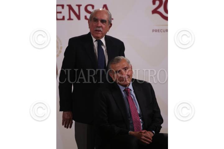 Adán Augusto López Hernández, secretario de Gobernación y Pablo Gómez Álvarez, titular de la Unidad de Inteligencia Financiera durante conferencia de prensa en Palacio Nacional.