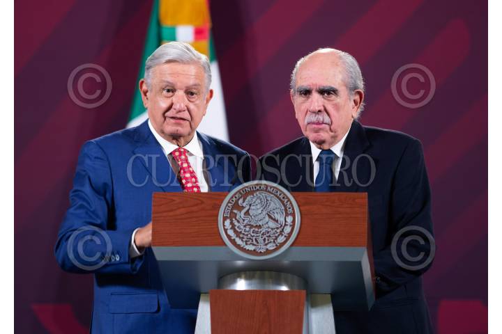 Andrés Manuel López Obrador, Presidente de México, y Pablo Gómez Álvarez, titular de la Unidad de Inteligencia Financiera (UIF) de la Secretaría de Hacienda y Crédito Público (SHCP), durante la mañanera.