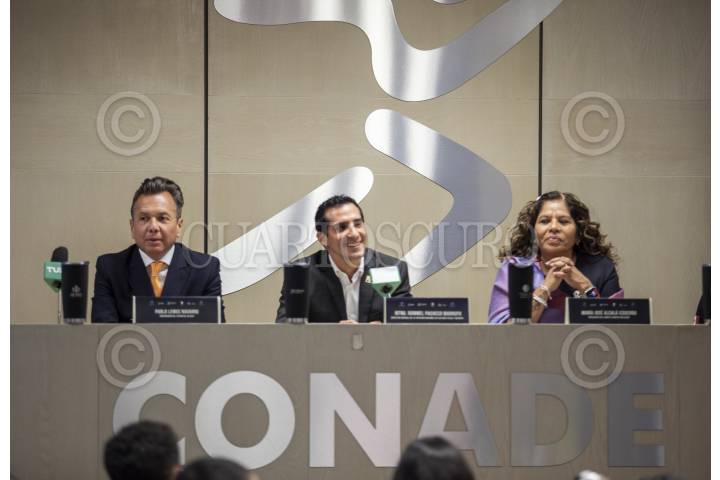 CIUDAD DE MÉXICO, 11MARZO2025.- Luis Fernando Ortega Ramons. Director Code Jalisco; Andrea Blanco Calderon, coordinadora general estrategia y desarrollo social; Pablo Lemus Navarro, Gobernador de Jalisco; Romel Pacheco Marrufo, director de la comisión nacional cultura física y deporte; María José Alcalá Izguerra, presidenta del Comité olímpico Mexicano; Gabriela Guillen Agundez Garcia, Medallista Olimpica y Osmar Olvera, medallista Olímpico ofrecieron conferencia de prensa para hablar sobre el evento de natación World Aquatics diving world cup que se llevará a cabo del 3 a 9 de abril en la Ciudad de Guadalajara. FOTO: ANDREA MURCIA /CUARTOSCURO.COM