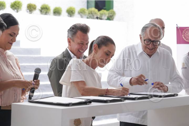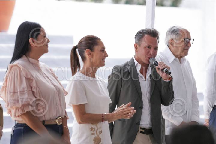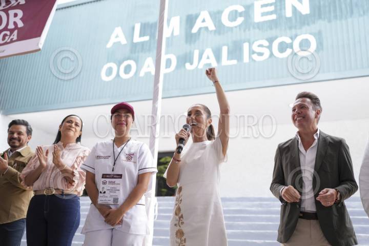 TLAQUEPAQUE, JALISCO, 25MAYO2025.- Zoé Robledo, director del IMSS; Ariadna Montiel, secretaria de Bienestar; Claudia Sheinbaum, Presidenta de México; y Pablo Lemus, gobernador de Jalisco, durante la firma de convenio de colaboración que celebran la Secretaría de Bienestar y el IMSS para la implementación del programa de salud “Casa por Casa”. Ante la presencia de cientos enfermeras, enfermeros, médicos y médicas que llevarán servicios de salud a miles de hogares en todo el país, quienes se dieron cita en el almacén del IMSS Delegación Jalisco. FOTO: PRESIDENCIA/CUARTOSCURO.COM