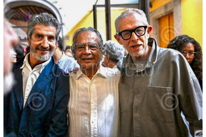 CIUDAD DE MÉXICO. 13ABRIL2025.- Inauguración de la exposición “Pedro Valtierra. Volver a la tierra del Quetzal”, en el Centro de la Imagen, ubicado en Plaza de la Ciudadela, Centro Histórico. Pablo Ortíz Monasterio, Pedro Valtierra y Pablo Aguinaco, en el evento. FOTO: CUARTOSCURO COM