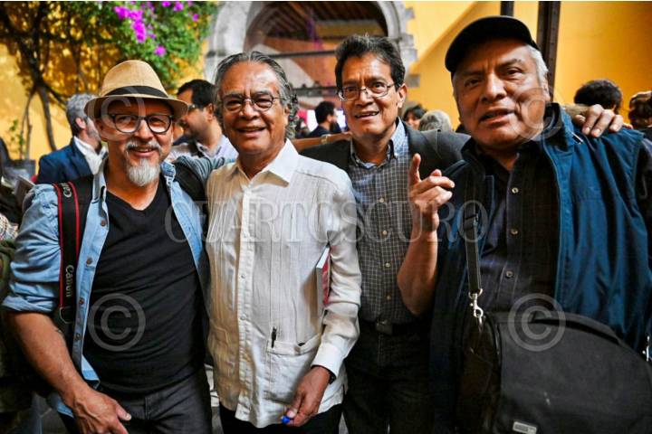 CIUDAD DE MÉXICO. 13ABRIL2025.- Inauguración de la exposición “Pedro Valtierra. Volver a la tierra del Quetzal”, en el Centro de la Imagen, ubicado en Plaza de la Ciudadela, Centro Histórico. Víctor Mendiola, Pedro Valtierra, Eloy Valtierra y Tomás Martínez, en el evento. FOTO: CUARTOSCURO COM