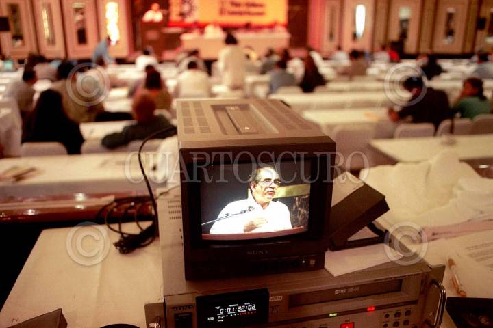 Pablo Gómez, representante del PRD ante el IFE, durante la sesión ordinaria de este viernes en dicho instituto. El perredista presentó ayer por la tarde un video en donde muestra un cheque emitido por Banorte, por la cantidad de 640 millones de pesos, dinero que se extrajo de las cuentas del sindicato de PEMEX y que según Pablo Gómez se destinó a la campaña presidencial del priísta Francisco Labastida. FOTO: Pedro Mera/CUARTOSCURO.COM