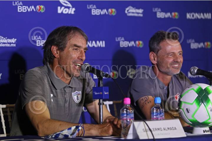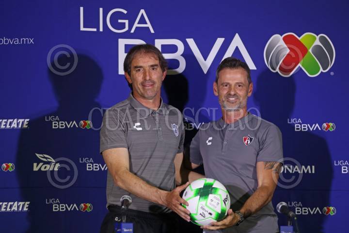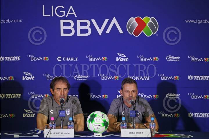 Guillermo Almada (DT Pachuca) y Diego Cocca (DT Atlas), durante la conferencia de prensa que ofrecieron esta noche en las instalaciones del Estadio Jalisco.