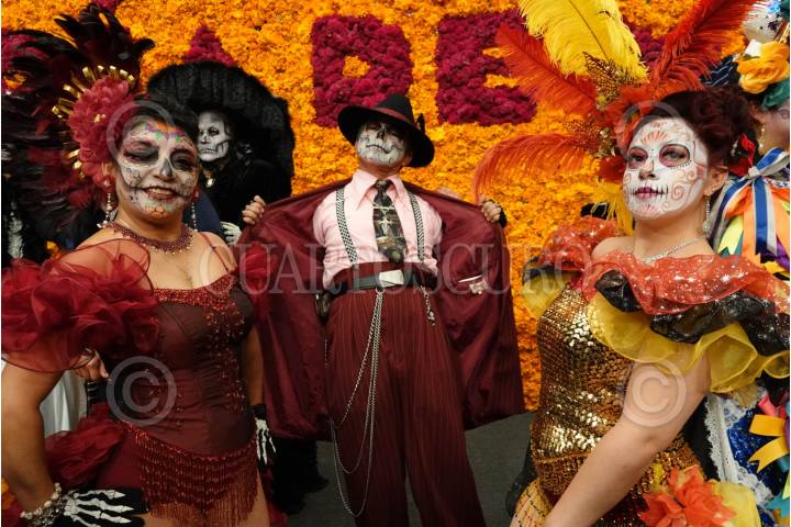 CIUDAD DE MÉXICO, 21OCTUBRE2024.- Catrinas y pachucos durante la conferencia en donde presentó el programa de Día de Muertos en el Museo de la Ciudad de México. FOTO: GRACIELA LÓPEZ/CUARTOSCURO.COM