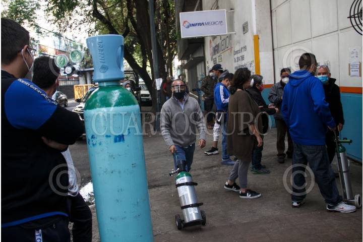 Personas esperan su turno para rellenar sus tanques de oxígeno. La mayoría es para pacientes Covid-19 positivos que se atienden en casa