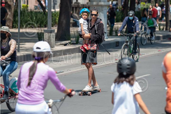 Padre e hijo patinan en el Paseo Ciclista en Reforma.