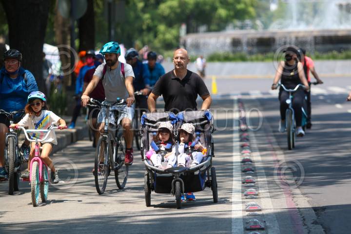 Capitalinos durante el paseo ciclista en avenida Reforma. Un padre da familia trota con sus gemelos, quienes viajan en una carriola.