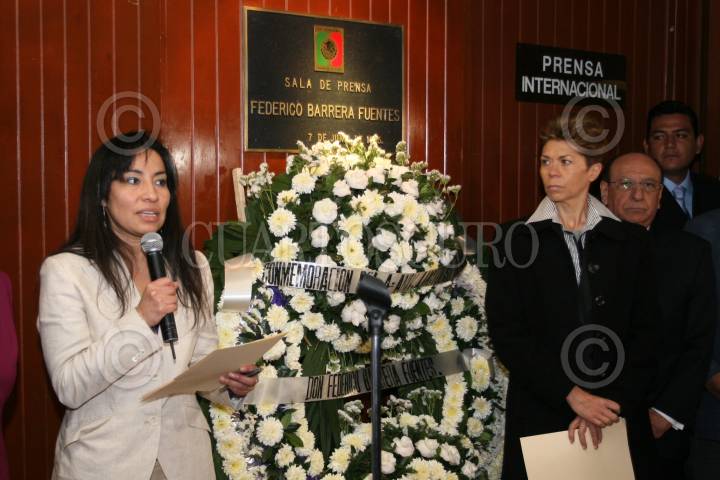 MÉXICO D.F. 28FEBRERO2008.-Las diputadas Ruth Zavaleta (PRD) y Beatriz Pajes (PRI) rindieron homenaje póstumo al periodista Federico Barrera Fuentes por su cuarto aniversario de fallecido, esto en la sala de prensa que lleva su nombre en la Cámara de Diputados. FOTO: GUILLERMO PEREA/CUARTOSCURO.COM