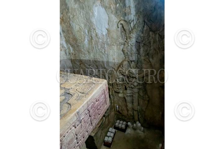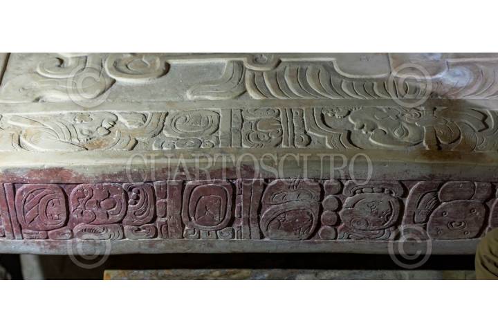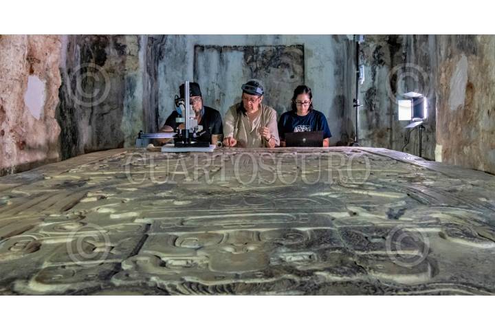 PALENQUE, CHIAPAS, 12AGOSTO2023.- El INAH emprende nuevos estudios de conservación en la lápida de Pakal. A temperaturas de 25 o 28oC y con una humedad de 98% o 100%, el equipo, coordinado por la restauradora Haydeé Orea Magaña y el químico Javier Vázquez Negrete, y formado también por los restauradores Jorge Coraza Borjas y Karen Limón Torres, realizó pruebas para generar una propuesta de limpieza de la lápida de Pakal. La losa, de 3.80 metros de largo, 2.20 metros de ancho y 25 centímetros de espesor, narra en su iconografía la vida de Pakal y sus ancestros, a la vez que ilustra cómo el personaje desciende al inframundo y renace convertido en una deidad del maíz. FOTO: INAH/CUARTOSCURO.COM
