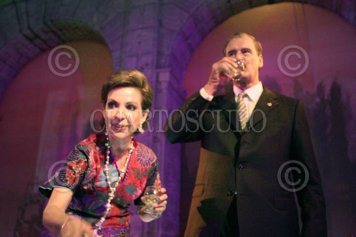 México, D.F, 16SEPTIEMBRE2004.- Vicente Fox Quesada, presidente de la República y Marta Sahagún, primera dama, brindan con los invitados en la noche mexicana organizada en Palacio Nacional, después del tradicional grito de Independencia. FOTO: Moisés Pablo/CUARTOSCURO.COM