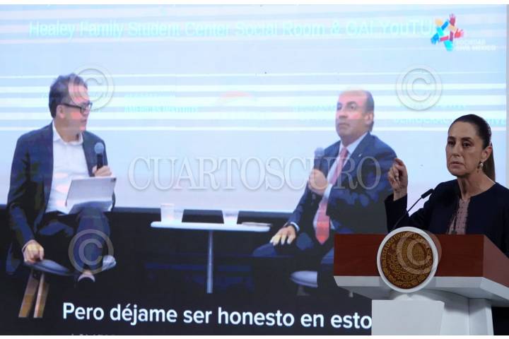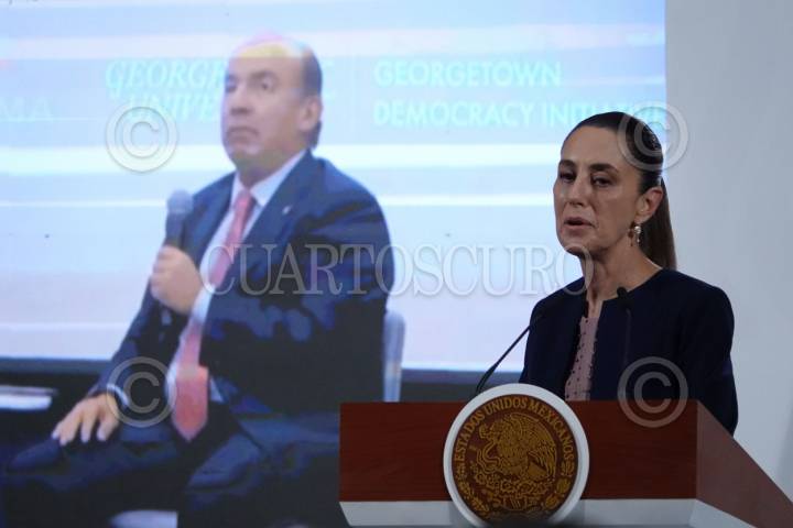CIUDAD DE MÉXICO, 10SEPTIEMBRE2025.- La presidenta Claudia Sheinbaum Pardo muestra la entrevista que el ex presidente Felipe Calderón sostuvo en Estados Unidos en la que se posicionó respecto a la Reforma judicial, durante la conferencia “Mañanera del Pueblo” desde Palacio Nacional en la que se abordaron detalles de sobre el recién entregado Paquete Económico 2026 FOTO: GALO CAÑAS/CUARTOSCURO.COM