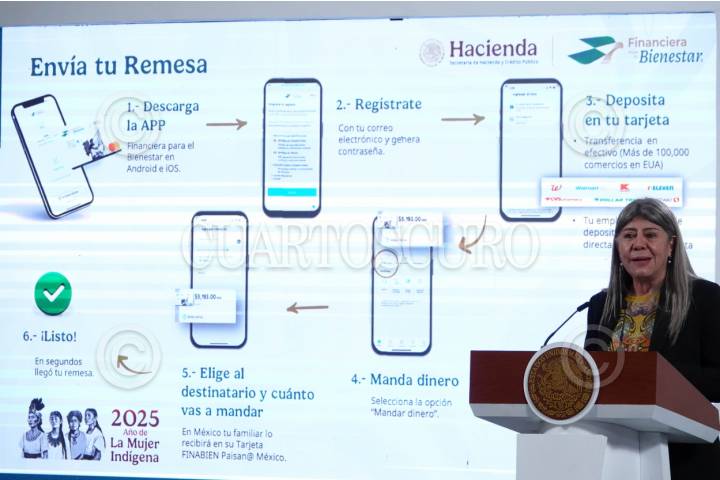 CIUDAD DE MÉXICO, 17SEPTIEMBRE2025.- María del Rocío Mejía, directora general de Financiera para el Bienestar, muestra el proceso para el envío de remesas a través de la aplicación FINABIEN durante la conferencia matutina desde Palacio Nacional.  FOTO: GALO CAÑAS/CUARTOSCURO.COM