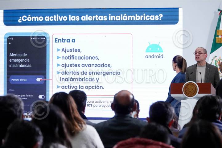 CIUDAD DE MÉXICO, 17SEPTIEMBRE2025.- José Antonio Peña Merino, titular de la Agencia de Transformación Digital y Telecomunicaciones, explica sobre las alertas que se recibirán el próximo 19 de septiembre durante el simulacro nacional durante la conferencia matutina desde Palacio Nacional.  FOTO: GALO CAÑAS/CUARTOSCURO.COM