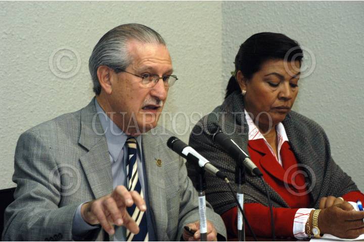 MÉXICO D.F. 05JUNIO2006.- El diputado, Jesús González Shcmal junto con la diputada Martha Palafox, de la comisión investigadora del caso de los hermanos Bibriesca, durante la conferencia de prensa, donde dio a conocer que han encontrado más predios adquirido por los hermanos Bibriesca en el estado de Guerrero. FOTO: Guillermo Perea/CUARTOSCURO.COM