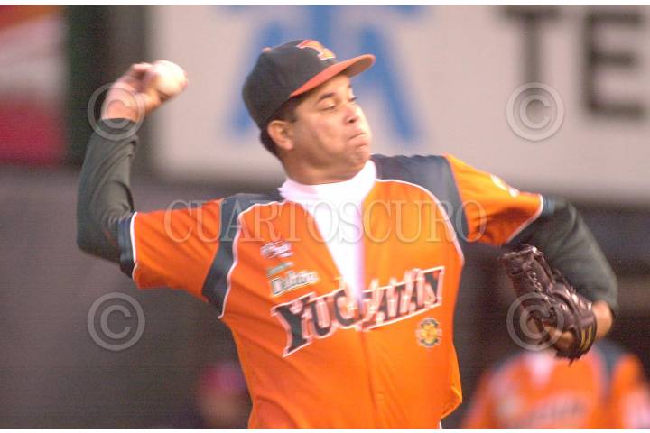 México, D.F. 02 ABRIL 2004.- Juan Manuel Palafox (pitcher de los leones de Yucatán) lanza una bola en el primer juego de la serie entre Leones de Yucatán y de los Diablos Rojos del México. FOTO: Iván Stephens/CUARTOSCURO.COM
