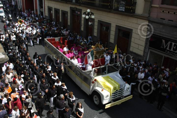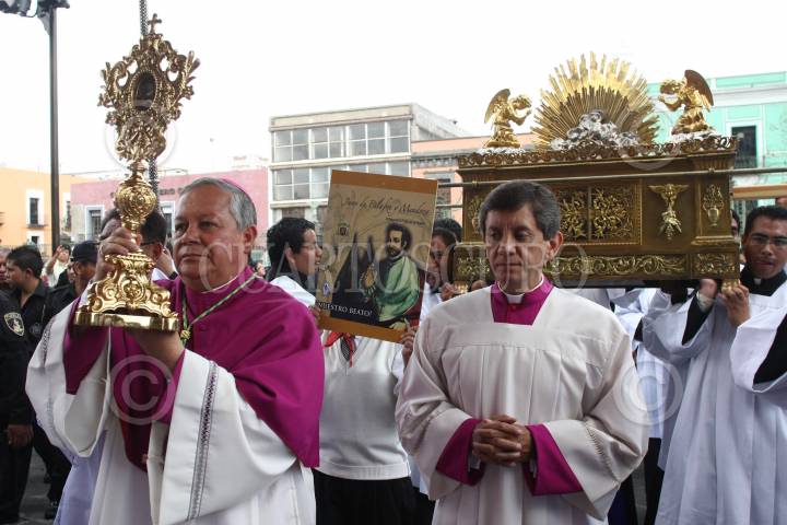 PUEBLA, PUEBLA, 24JUNIO2011.- Se realizó una peregrinación para recibir en la catedral de Puebla, las reliquias del beato Juan de Palafox, donde recorrieron desde la capilla de la Villita pasando por la avenida Reforma hasta llegar a la catedral de Puebla. Con una gran fiesta religiosa, los fieles alabaron el regreso del obispo luego de tener 362 años de ausencia. FOTO: FRANCISCO GUASCO/CUARTOSCURO.COM