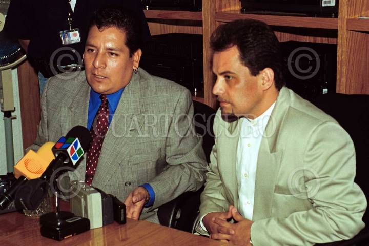 Charly Becies y Memo Palafox, integrantes del grupo de música tropical "Angeles de Charly", en rueda de prensa aclararon los asuntos referentes a la demanda interpuesta por el grupo Angeles Azules, por la cual estuvieron detenidos en el reclusorio oriente. FOTO: Eduardo Loza/CUARTOSCURO.COM