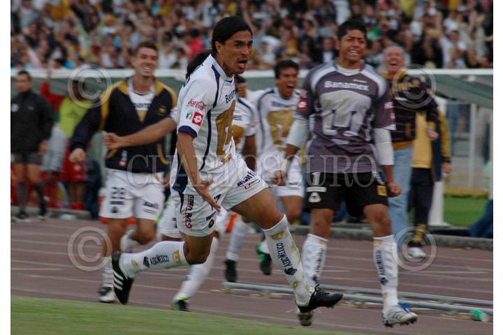 MÉXICO, D.F., 16MAYO2009.- Juan Francisco Palencia de los pumas de la UNAM festeja con sus compañeros su anotación en contra de los Tecos de la UAG en partido de cuartos de final del Clausura 2009 del futbol mexicano; venciendo los Pumas 3 goles a 0 y pasando estos a las semifinales. FOTO: RODOLFO ANGULO/CUARTOSCURO.COM