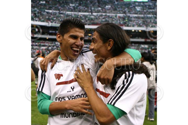 MÉXICO D.F., 10OCTUBRE2009.- Carlos Salsido y Francisco Palencia festejan al termino del partio entre la Selección Mexicana de Futbol y su similar de El Salvador, ganando México 3 goles a 1 en el ultimo partido del hexagonal final rumbo a Sudafrica 2010 que se realizo en el estadio Azteca. FOTO: RODOLFO ANGULO/CUARTOSCURO.COM