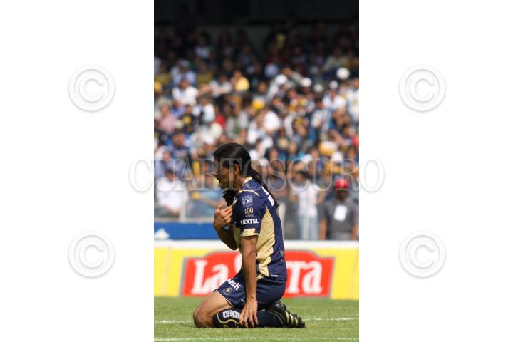 MÉXICO, D.F., 15NOVIEMBRE2009.- Juan Francisco Palencia se lamenta durante el juego de Pumas de la UNAM donde se despidieron del torneo Apertura 2009 con un empate 1-1 ante Indios de Ciudad Juárez FOTO: SÁSHENKA GUTIÉRREZ/CUARTOSCURO.COM