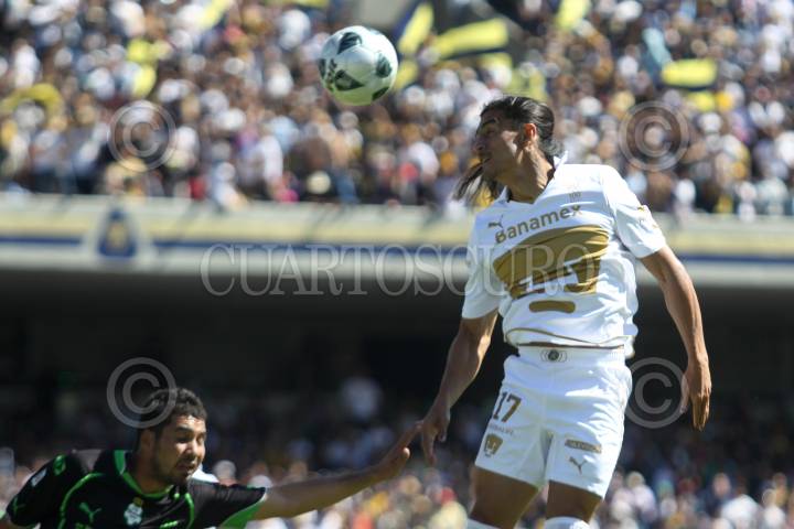 MÉXICO D.F. 16ENERO2011.- Juan Francisco Palencia de los Pumas de la UNAM intenta rematar durante el encuentro en contra del Santos Laguna que se realizo en el Estadio Olímpico Universitario; partido de la jornada 3 del torneo Clausura 2011 del fútbol mexicano donde los Pumas ganaron 2 goles por 0. FOTO: RODOLFO ANGULO/CUARTOSCURO.COM