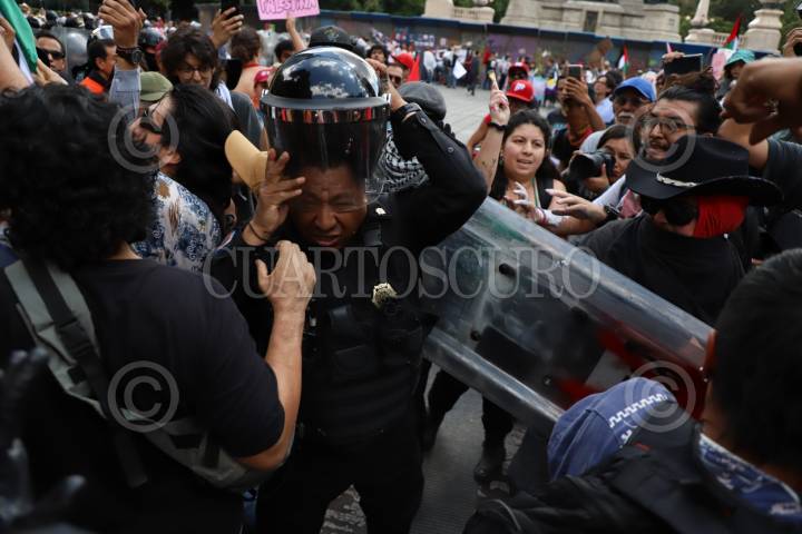 CIUDAD DE MÉXICO, 17AGOSTO2025.- Los manifestantes se confrontaron con los elementos de la policía previo al inicio de la marcha. FOTO: DANIEL AUGUSTO/ CUARTOSCURO.COM