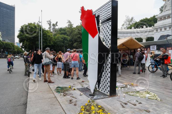 CIUDAD DE MÉXICO, 24AGOSTO2025.- Activistas pro Palestina bailaron frente al Antimonumento “Palestina vencerá”, colocado en la banqueta del Hemiciclo a Juárez. Exigieron que el gobierno capitalino no lo retire con motivo del Maratón de la CDMX y pidieron romper relaciones con Israel. FOTO: MOISÉS PABLO / CUARTOSCURO.COM