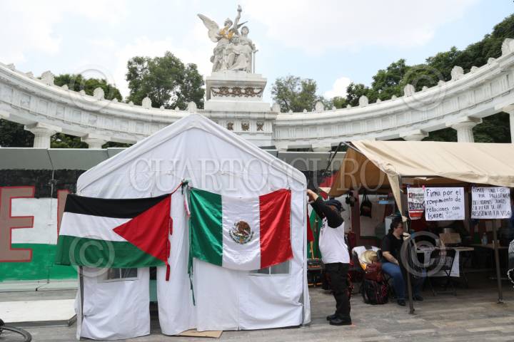 CIUDAD DE MÉXICO, 24AGOSTO2025.- Activistas pro Palestina realizaron un baile frente al Antimonumento “Palestina vencerá”, colocado hace unas semanas sobre la banqueta del Hemiciclo a Juárez, frente a la Secretaría de Relaciones Exteriores. La acción tuvo como objetivo exigir al gobierno capitalino que no retire la estructura con motivo del Maratón Internacional de la Ciudad de México, programado para el próximo domingo. También pidieron al gobierno mexicano romper relaciones con Israel. FOTO: MOISÉS PABLO / CUARTOSCURO.COM