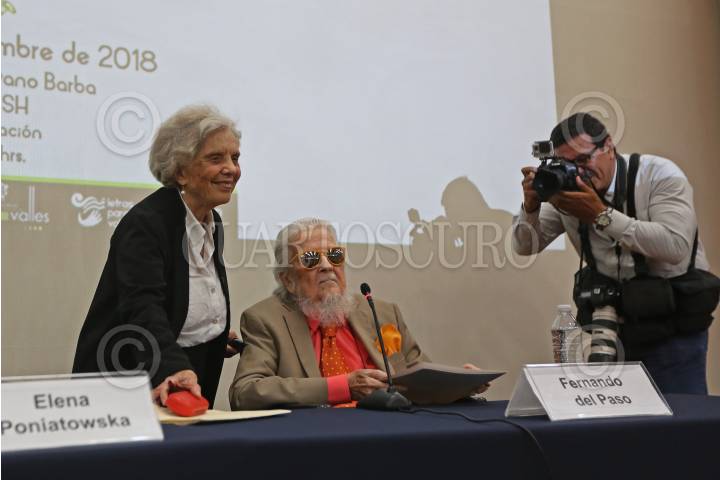 GUADALAJARA, JALISCO, 04SEPTIEMBRE2018.- Los escritores Elena Poniatowska y Fernando del Paso encabezaron la conferencia magistral "En Palinuro de México cabe el Mundo Entero", esto en el auditorio Salvador Allende del Centro Universitario de Ciencias Sociales y Humanidades (CUCSH) de la Universidad de Guadalajara, a mencionado evento asistió el escritor Juan Villoro. FOTO: FERNANDO CARRANZA GARCIA / CUARTOSCURO.COM