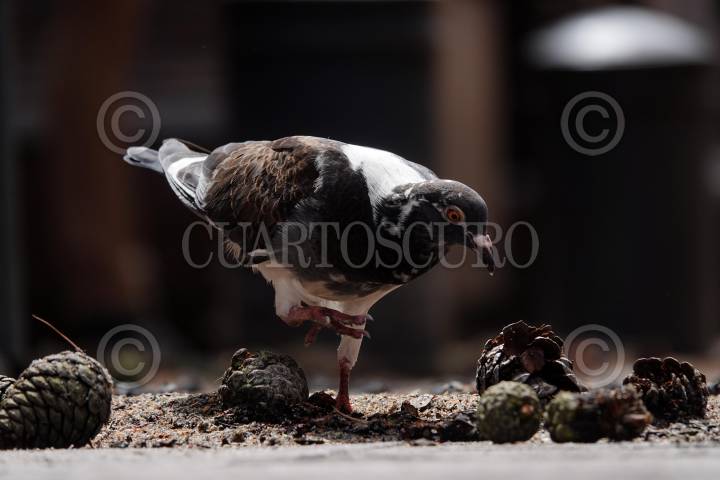 MORELIA, MICHOACÁN, 26OCTUBRE2023.- Una paloma juega con piñas secas en calles del Centro Histórico de Morelia. FOTO: GRACIELA LÓPEZ /CUARTOSCURO.COM