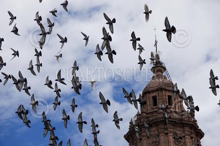 MORELIA, MICHOACÁN, 26OCTUBRE2023.- Frente a la Catedral de Morelia, una parvada de aves vuelan está tarde. FOTO: GRACIELA LÓPEZ /CUARTOSCURO.COM