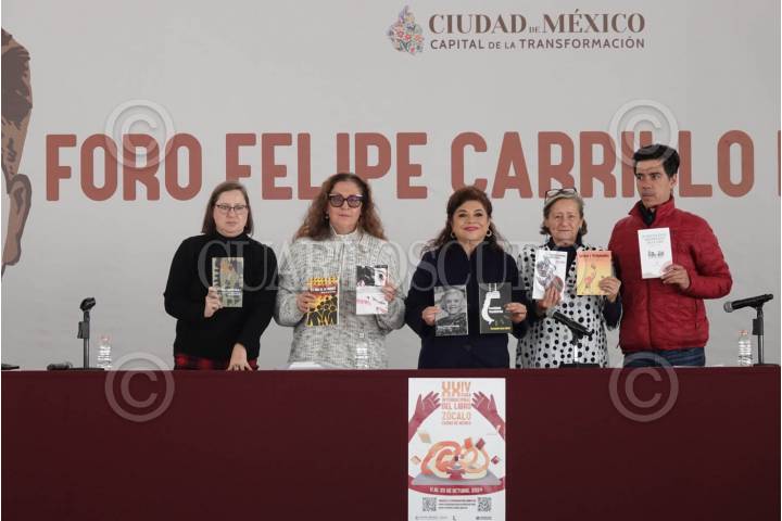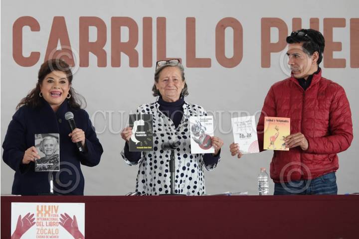 CIUDAD DE MÉXICO, 10OCTUBRE2024.- Marina Taibo, hija de Paco Ignacio Taibo II; Clara Brugada, jefa de Gobierno; Paloma Saiz, directora de la Brigada para leer en Libertad, durante la conferencia de prensa para anunciar la Feria del Libro en el Zócalo capitalino, la cual se llevará a cabo del 11 al 20 de octubre. FOTO: GRACIELA LÓPEZ/CUARTOSCURO.COM