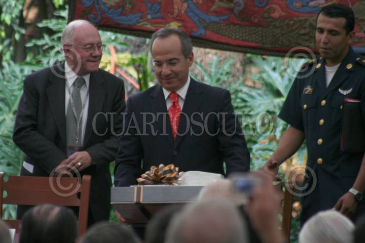 MÉXICO, D.F. MARZO2007.- El presidente Felipe Calderón visitó el Instituto Panamaericano de Alta Dirección de Empresa en su 40 aniversario. En la imagen con Carlos Garciarce Ramírez presidente de la junta de gobierno de dicha institución y Carlos Llano Cifuentes fundador del IPADE. FOTO: PAOLA HIDALGO/CUARTOSCURO.COM