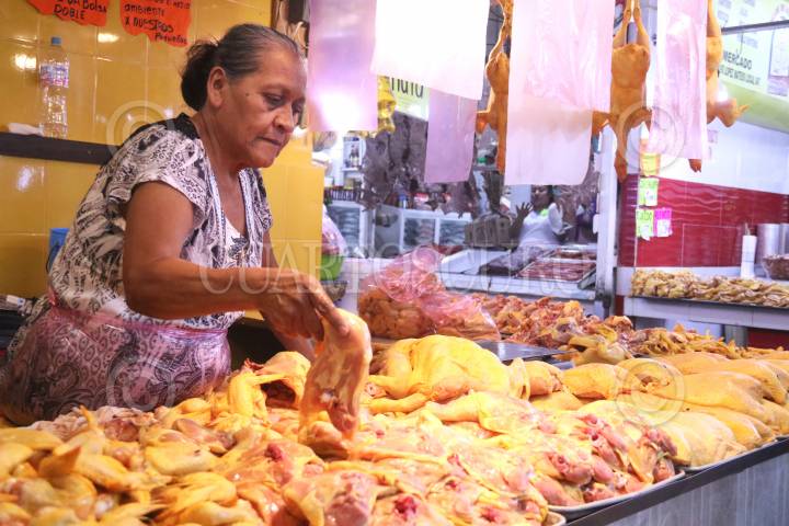 Una mujer destaza un pollo en el mercado Adolfo López Mateos, el precio de este alimento se ha mantenido sin alzas en las últimas semanas.