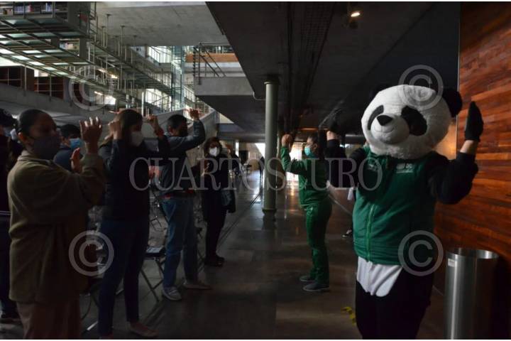 Personas rezagadas de la vacunación contra el Covid-19 pudieron ser inoculados en la Biblioteca Vasconcelos. En la imagen el oso Pandemio motiva a los asistentes.
