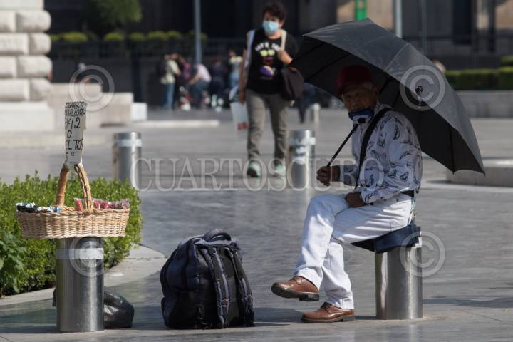 Un señor se cubre del los altos rayos del Sol en la Alameda Central en el el Centro Histórico