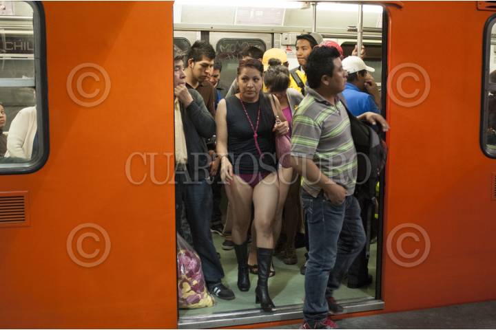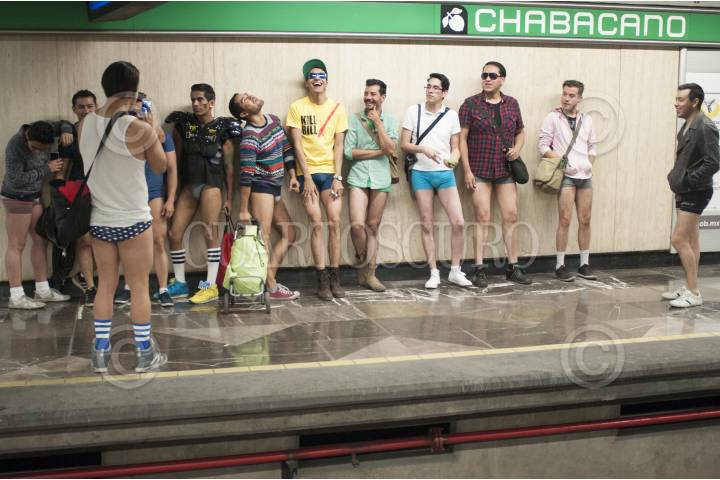 MÉXICO, D.F., 11ENERO2015.- Una persona decidió quitarse la ropa al ver a los jóvenes que pasearon sin pantalones por diversas estaciones del sistema colectivo metro, durante el quinto “Paseo sin Pantalones” organizado a través de redes sociales. De manera simultánea, habitantes de otras 40 ciudades en el mundo realizaron el viaje con el objetivo de crear escenarios urbanos fuera de lo común. FOTO: GUILLERMO PEREA /CUARTOSCURO.COM