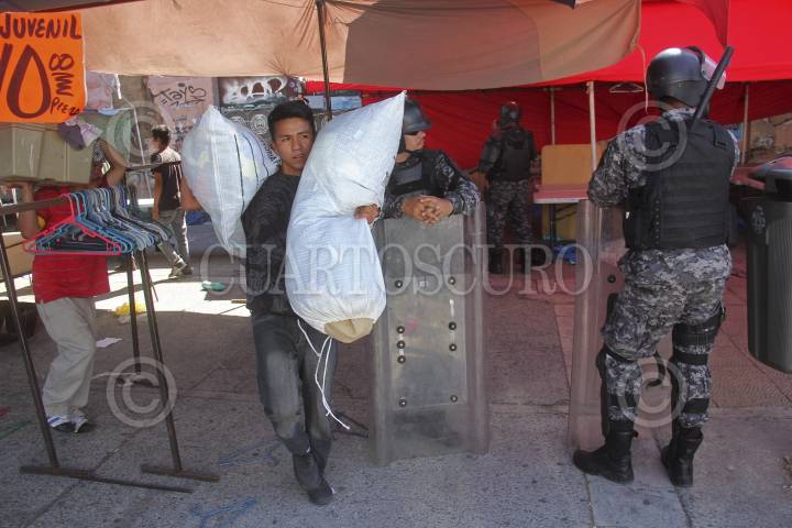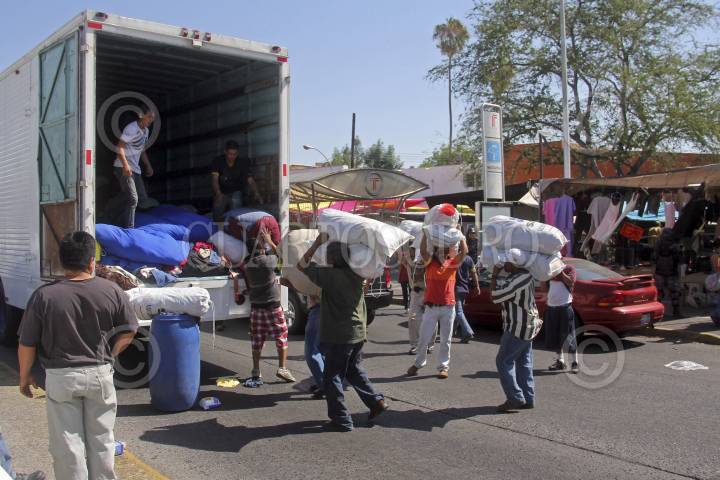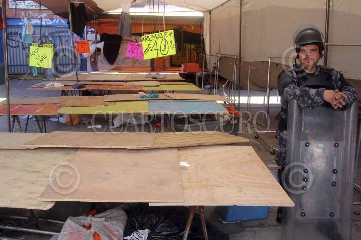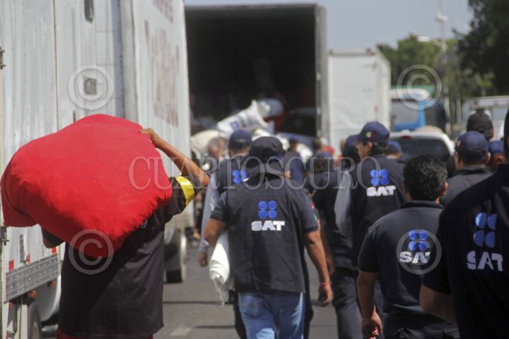 GUADALAJARA, JALISCO, 01ABRIL2014.- Esta mañana se llevo a cabo un operativo en el tianguis que se ubica frente al Panteón de Mezquitan, en donde se oferta en su mayoría ropa Americana, dicho operativo fue encabezado por Autoridades Federales de la Secretaria de Administración Tributaria (SAT) Auditoria de Comercio Exterior, apoyados por policías del Estado, mismos que decomisaron toneladas de prendas de ropa proveniente de Estados Unidos. FOTO: FERNANDO CARRANZA GARCIA /CUARTOSCURO.COM