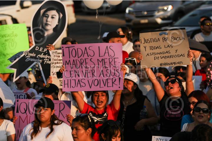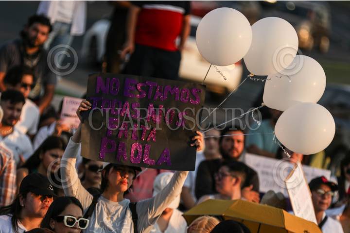 MEXICALI, BAJA CALIFORNIA, 12JULIO2024.- la tarde de ayer, colectivas, mujeres y sociedad en general se dieron cita en el monumento a Benito Juárez, sobre la avenida Justo Sierra; para exigir justicia por el feminicidio de Paola Bañuelos, quien el pasado domingo había sido reportada como desaparecida después de abordar un DiDi, al salir de un negocio de entretenimiento nocturno. La mañana del jueves fue localizado su cuerpo en la zona de Oasis Campestre, periferia de la ciudad fronteriza. FOTO: ADOLFO VLADIMIR /CUARTOSCURO.COM